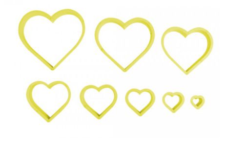 O Cortador Coração Liso tem um formato lindo. Cada kit contém oito peças, com tamanhos de 2,8 a 8,2 cm. Indicado para cortar massa de biscuit, massa de EVA, pasta americana, biscoitos e muito mais!