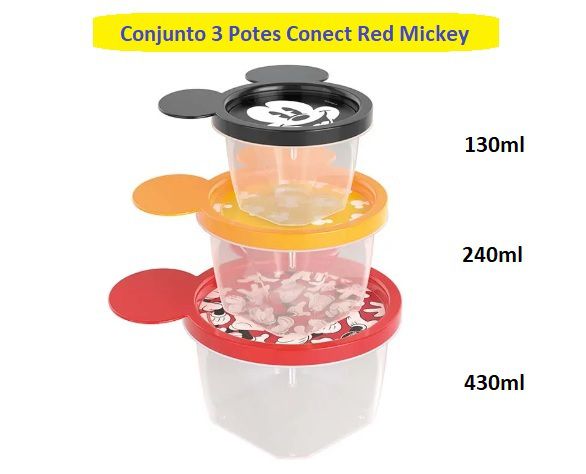 Kit 3 Potes Conect Red Mickey Plástico (430ml, 240ml e 130ml) - Plasútil