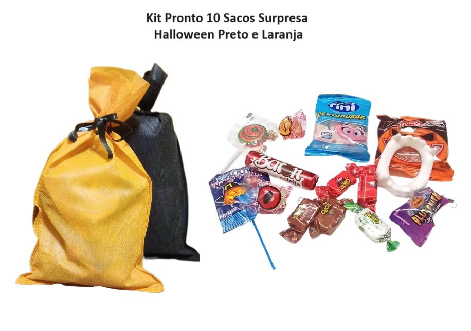kit 10 Sacos Surpresas Halloween com Doces (Preto e Laranja) - DF - Atende 10 crianças.